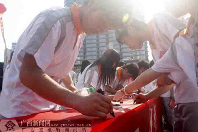 大学生在印有“拒绝盗版 助力创新”的条幅上签名