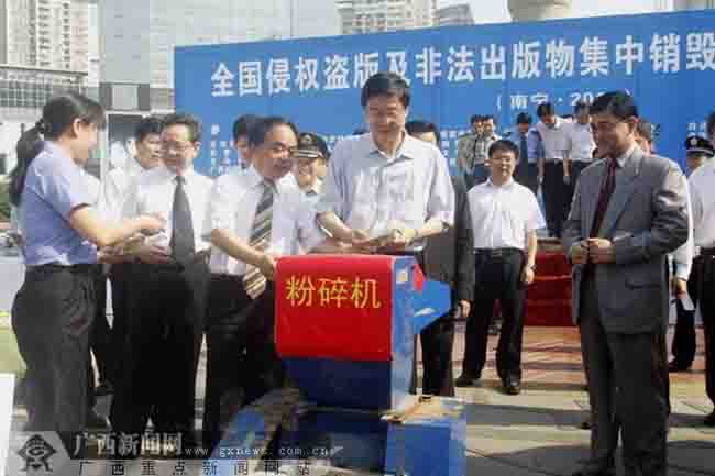 根据全国“扫黄打非”工作小组办公室统一部署,4月22日,广西“扫黄打非”工作小组在南宁市设2012年全国侵权盗版和非法出版物集中销毁活动主会场,在全区其他13个市设分会场,公开销毁85万件侵权盗版和非法出版物,以此警示、震慑违法犯罪分子和非法经营者,以实际行动迎接“4•26”世界知识产权日。当日,自治区党委常委、宣传部长、自治区“扫黄打非”工作小组组长沈北海与驻桂领事馆文化官员、区市“扫黄打非”工作小组领导及成员单位共同场上销毁侵权盗版制品,并向学生代表赠送图书和“绿书签”,众多相关从业人员及大学生在印有“拒绝盗版 助力创新”的条幅上签名。