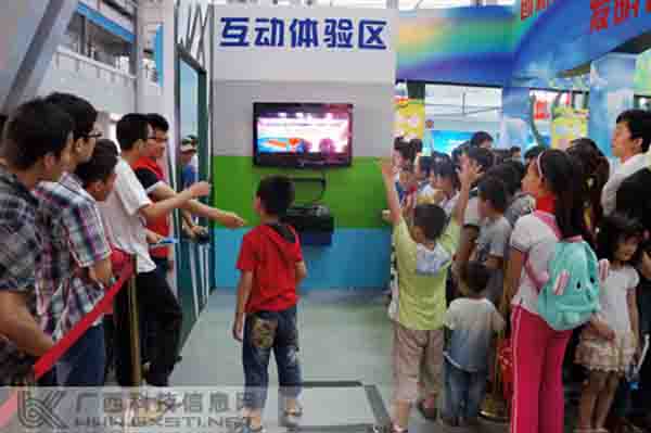 展区内专门设置了互动体验区,不仅展播了青少年创新成果的平台——青少年创新大赛、科学DV、高校科学营等活动,还特设了机器人展演和体感互动体验。互动区每天观众基本都是里三层外三层,活动区内人声鼎沸,参与体验的观众接踵摩肩,流连忘返。在这里观众亲自遥控体验的人形机器人;体感互动体验又让观众以自己的身体作为“控制器”直接与大屏幕链接,观众们可以原地做动作反馈到电脑屏幕上直接玩游戏。娱乐与科技的完美结合让观众眼前一亮,他们在参观同时又能放松心情参与互动,让整个展区欢乐多多。