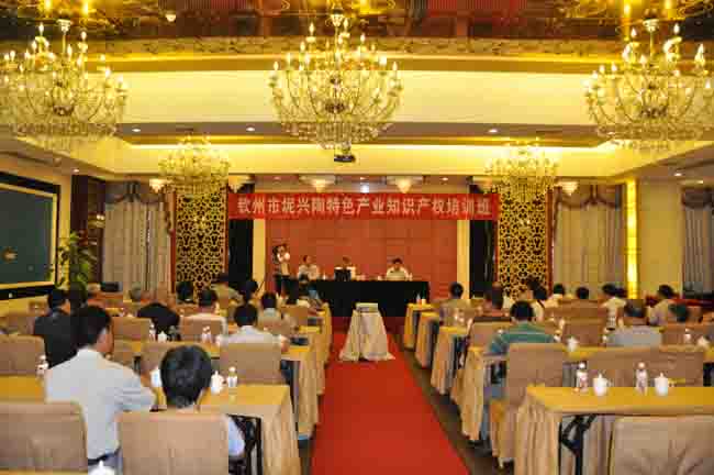 7月2日上午9:00,2013年钦州市知识产权系列培训班之钦州市坭兴陶特色产业知识产权培训班在钦州市恒商大酒店四楼会议室举行。参加此次培训班的人员有:自治区知识产权局法律事务处调研员祖晓光、钦州市科技局副局长黄岳联、桂林市持衡专利商标事务所有限公司的经理马兰女士和钦州市40家坭兴陶企业代表以及数名国家级、省级、市级坭兴陶大师。